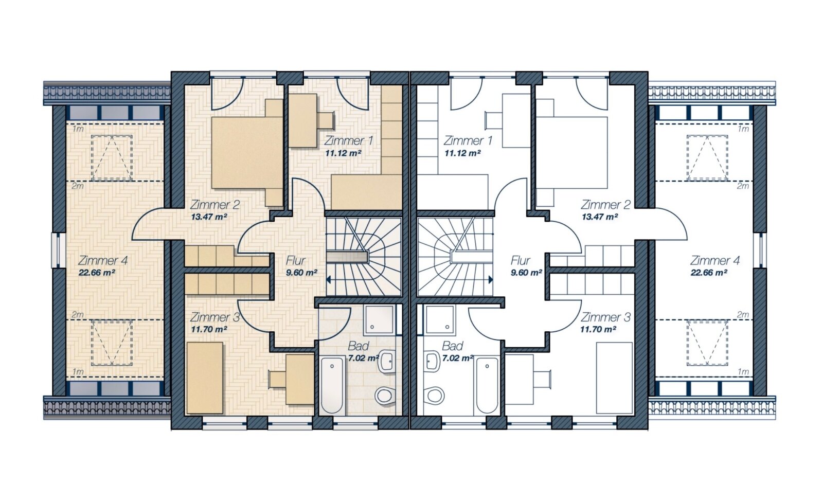 Die geplanten Haushälften verfügen jeweils über ca. 115 m² Wohnfläche auf zwei Vollgeschossen sowie zusätzliche Nutzflächen inklusive Spitzboden mit weiterem Nutzungspotenzial. Die massive Bauweise, moderne Haustechnik mit Fernwärmeversorgung und hochwertige Materialien gewährleisten eine nachhaltige und wertstabile Umsetzung.